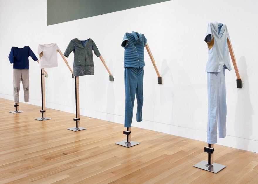 A set of hand-made outfits to express the emotional characteristics of discomfort that arise around interpersonal and group conflict. The wearable-sculptural objects are a proposal for a set of rules and procedures around expressing discomfort and vulnerability in public space. These garments were worn by me both during intentional performances and more casually at social events. The clothing includes interventions like 10lbs of weighted compression at the shoulders, abdomen and groin, sweat stains painted directly on, exaggerated saggy knees and painted chafe marks making standard the points where the body alters the form of the garment.