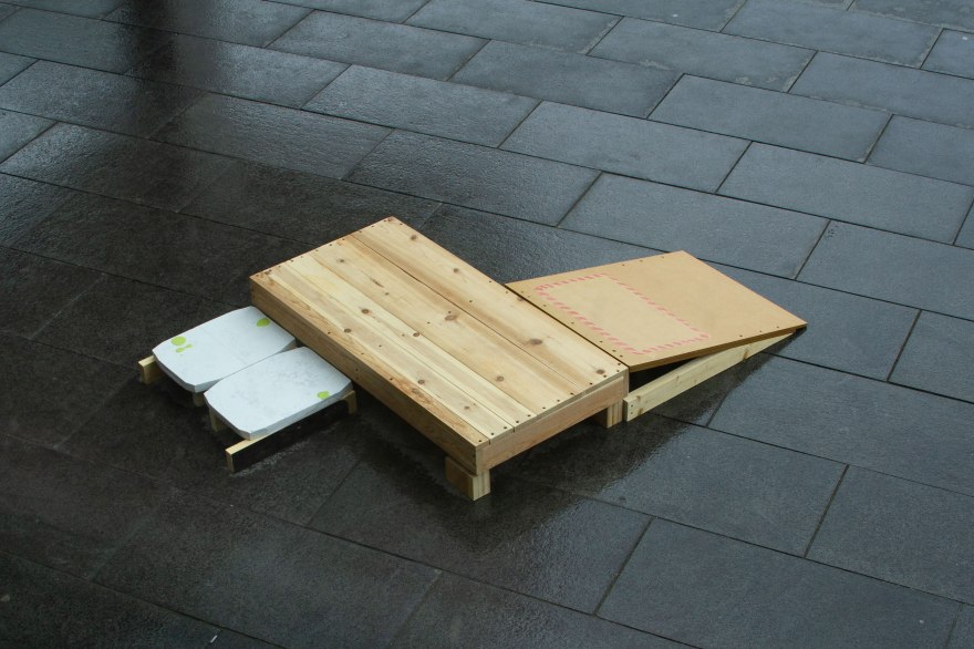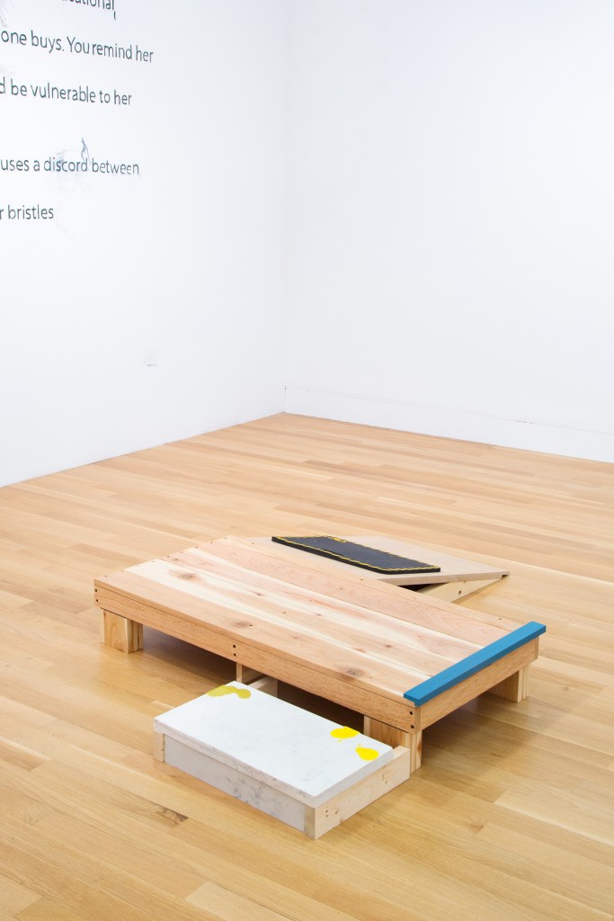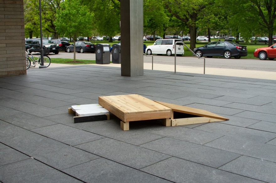The platform sculptures were installed both in and out of the gallery at the Logan Center at the University of Chicago. Identifying hinge points in the architecture where people gather and chat, I anonymously placed the modular platforms creating stages for those interactions. The small lift off the ground both welcomes and isolates the figure creating temptations for public announcement and judgement.