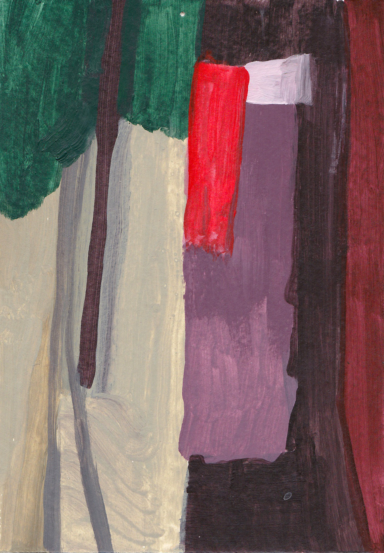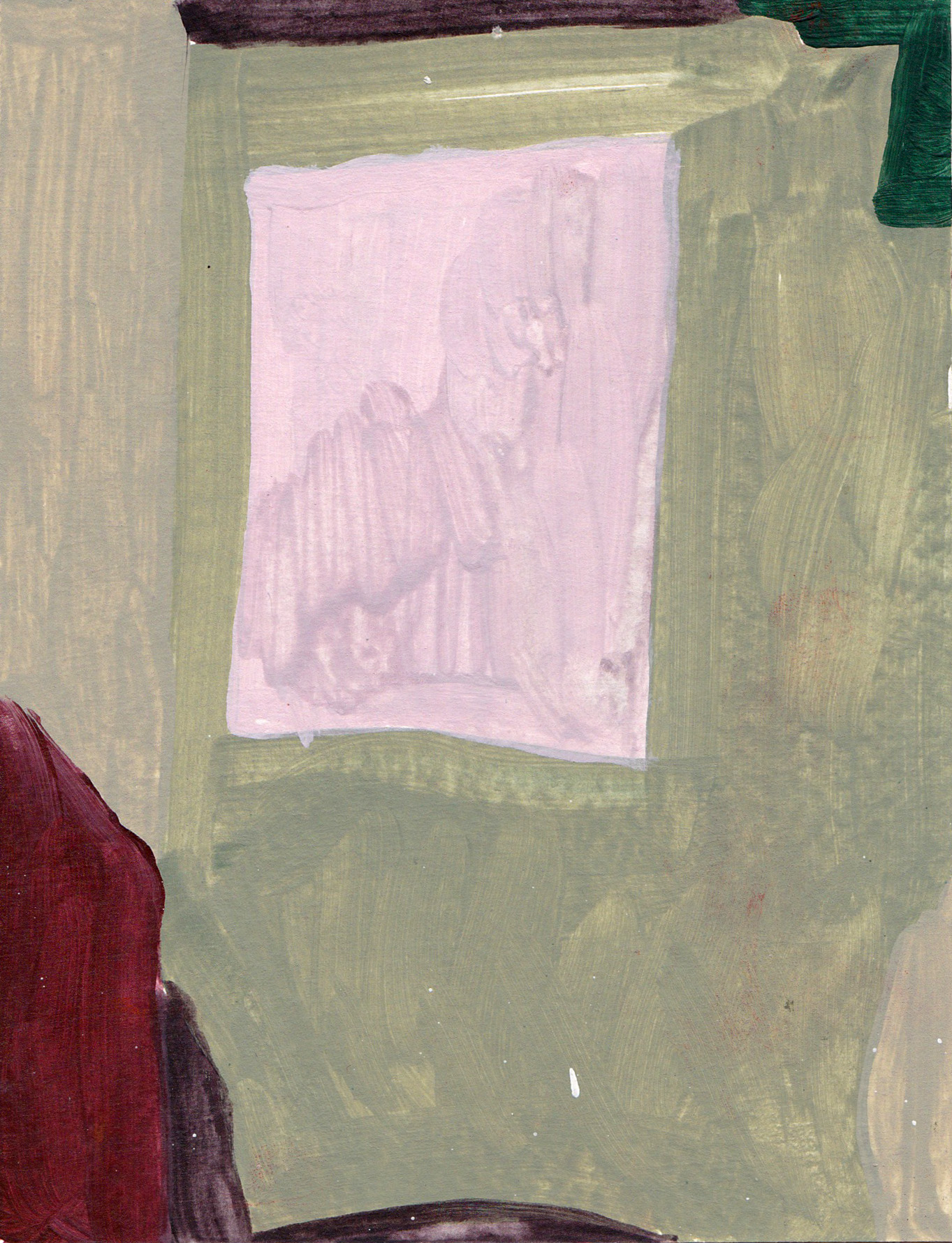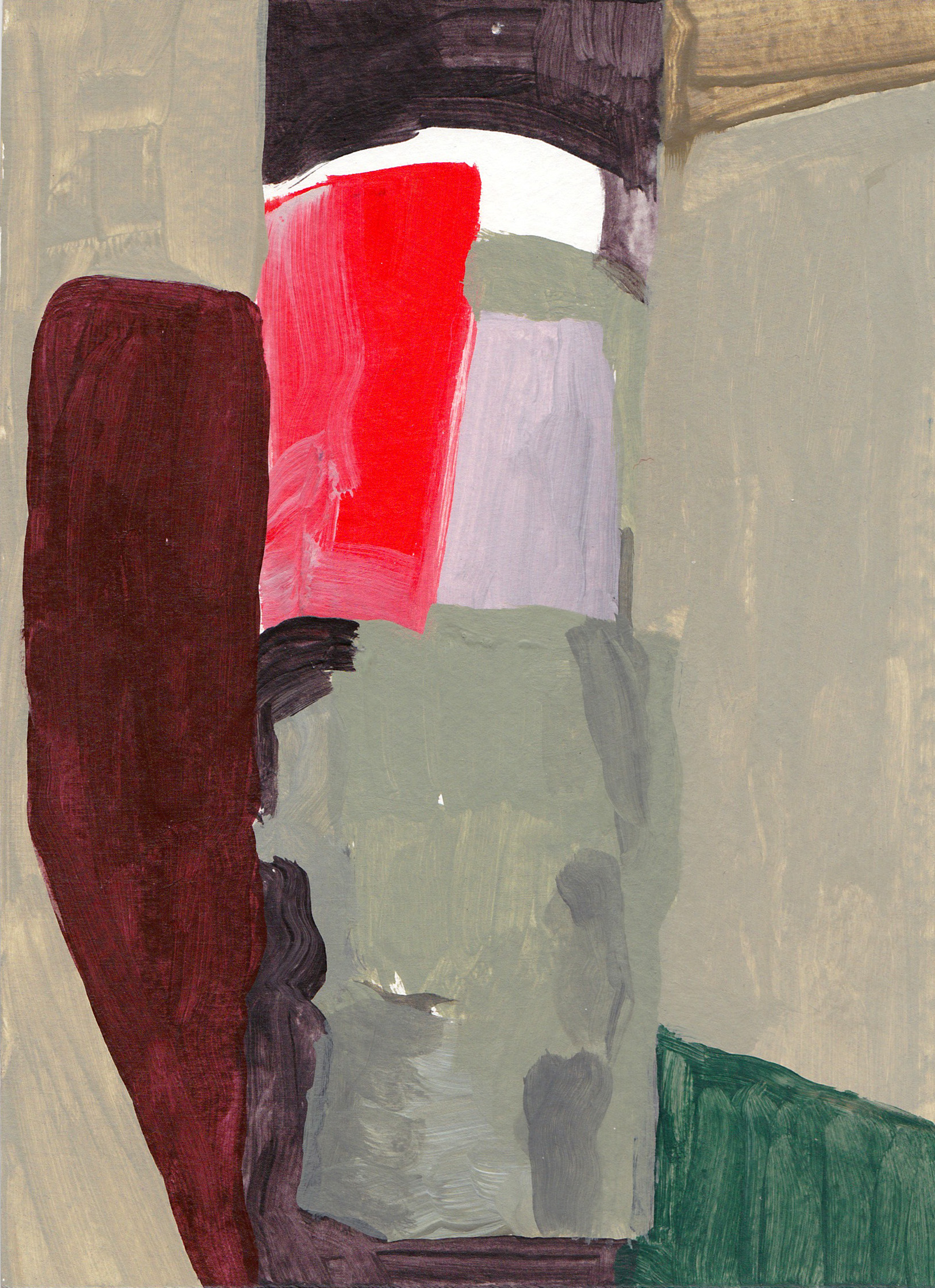 The works in this project are prompted by the question: how is government imaged? Provoked by a posted sign in my neighborhood declaring anger and a conspiracy theory at a local woman State’s Attorney, I began experimenting with the forms on the street and expanding the space around this sign: what is the context? what is the sign in relation to? I found that a language of abstraction could be a tool to answer the initial question – and specific colors became characters in this story about the alleged “crooked woman” : the orange traffic-law violation, the phlegm- yellow newspaper frames, the sidewalk and road with its accompanying shapes of planted green polygons, red patterned crosswalks, and the brown verticals waiting by the local bus stop.