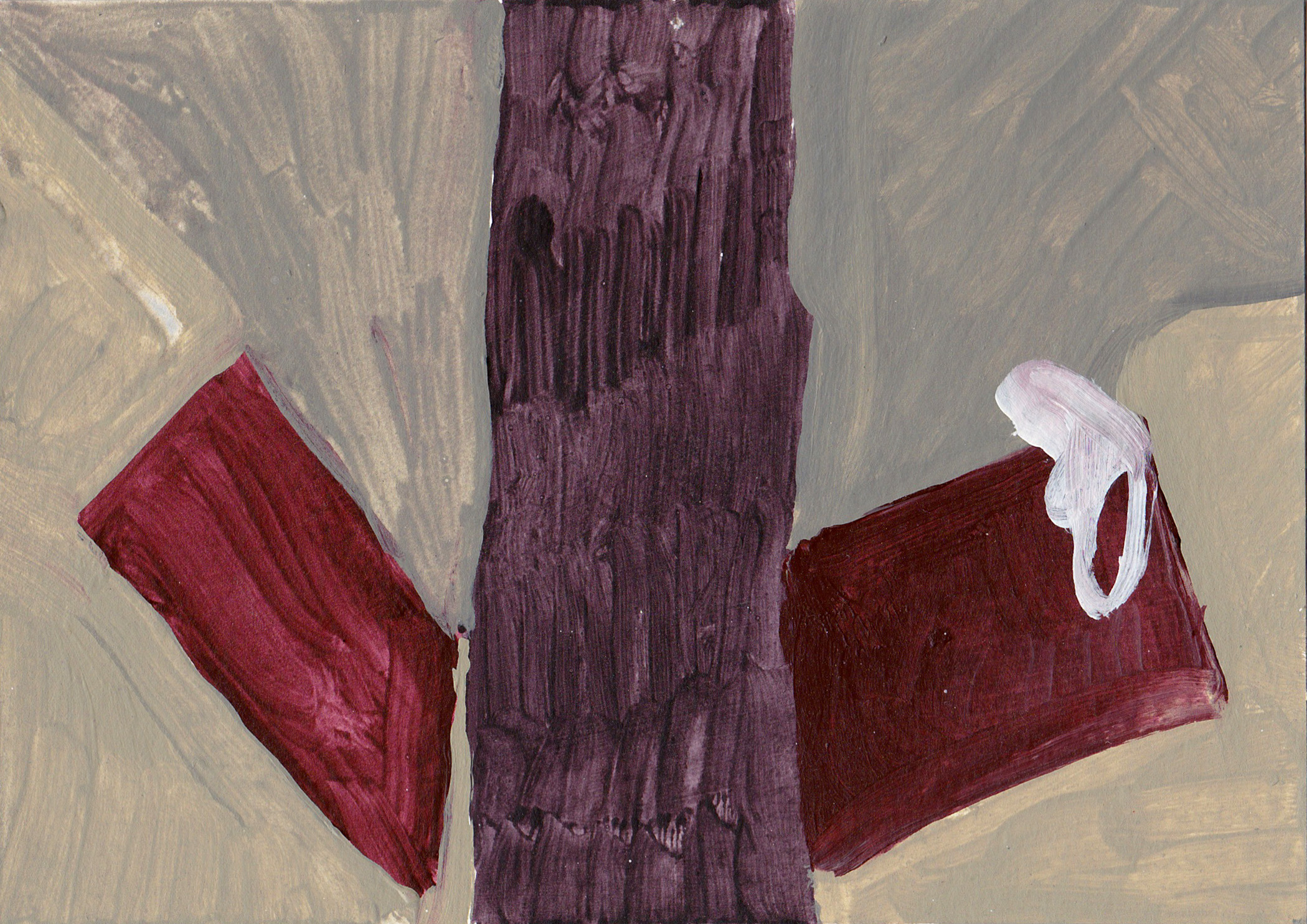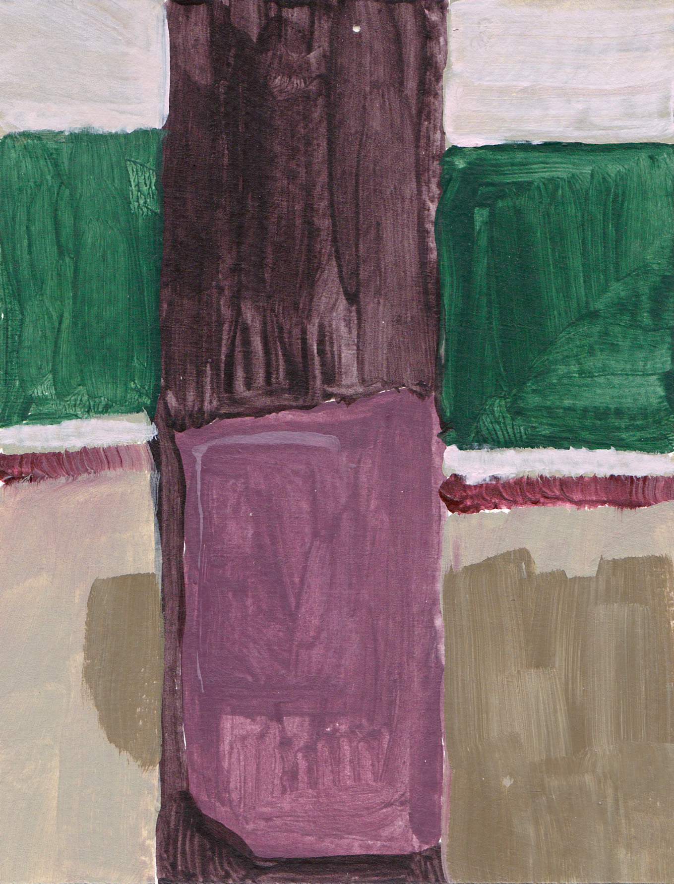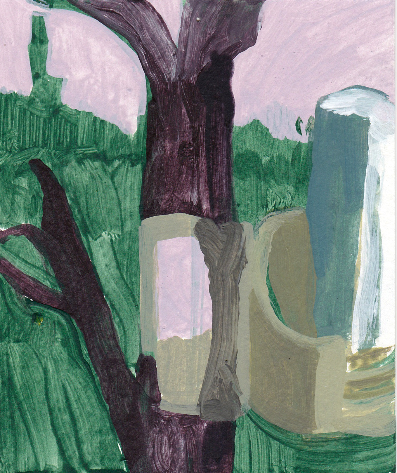 The works in this project are prompted by the question: how is government imaged? Provoked by a posted sign in my neighborhood declaring anger and a conspiracy theory at a local woman State’s Attorney, I began experimenting with the forms on the street and expanding the space around this sign: what is the context? what is the sign in relation to? I found that a language of abstraction could be a tool to answer the initial question – and specific colors became characters in this story about the alleged “crooked woman” : the orange traffic-law violation, the phlegm- yellow newspaper frames, the sidewalk and road with its accompanying shapes of planted green polygons, red patterned crosswalks, and the brown verticals waiting by the local bus stop.